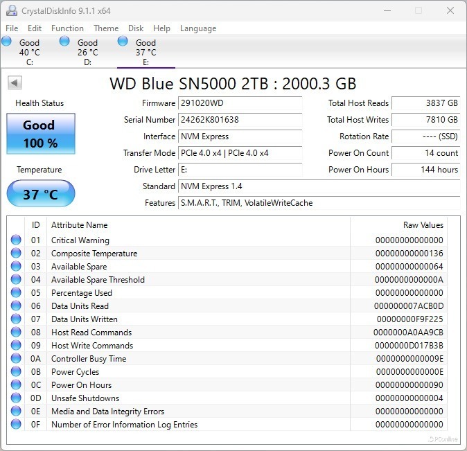 测试开始前,依照惯例,我们先用Crystal Disk Info查看下这款固态硬盘的基本信息。软件数据中可以看到WD Blue SN5000固态硬盘的固件版本为291020WD,传输模式为PCIe 4.0 x4,支持NVMe 1.4标准,支持S.M.A.R.T、TRIM以及VolatileWriteCache功能,硬盘在无负载的情况下,待机温度为37度。
