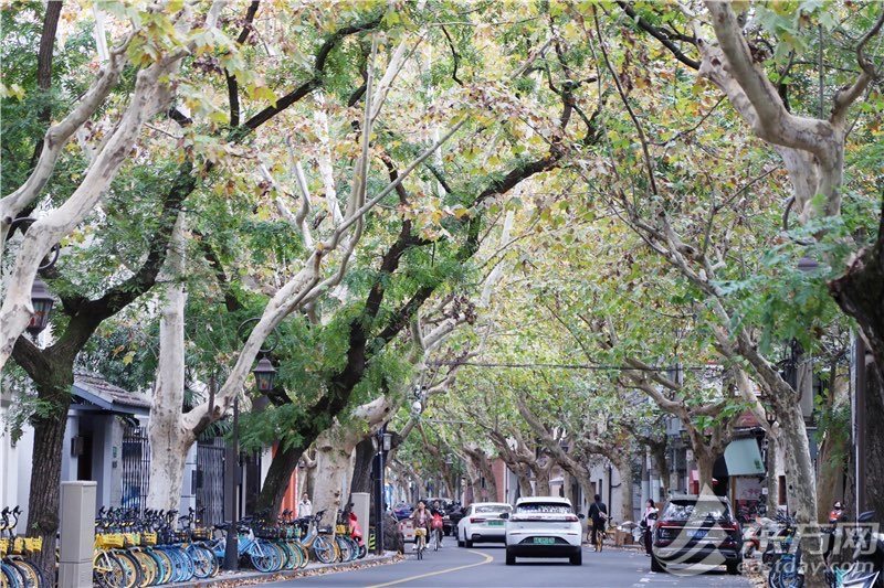 巨鹿路常熟路-富民路段入选今年的悬铃木“落叶不扫”景观道。12月4日,两旁参天的梧桐树呈黄绿渐变色,金灿灿的黄和尚未褪去的绿意让巨鹿路美得仿若一幅油画。枯黄的落叶飘落地面,仿佛铺上了一层金黄的地毯。