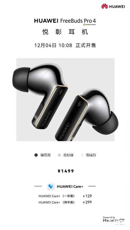 华为FreeBuds Pro 4定价1499元, 12月4日10:08全渠道正式开售,用户可登陆华为商城及各大授权电商平台,或前往华为体验店、华为授权零售门店进行选购。购买华为FreeBuds Pro 4 悦彰耳机,附赠权益卡在鸿蒙NEXT手机可免费兑换1个月超钻会员;叠加鸿蒙NEXT先锋权益,还可领取3个月华为音乐会员,同步可升超钻会员;累计可获4个月免费畅听权益,享受全曲库超高清和全曲库空间音频。