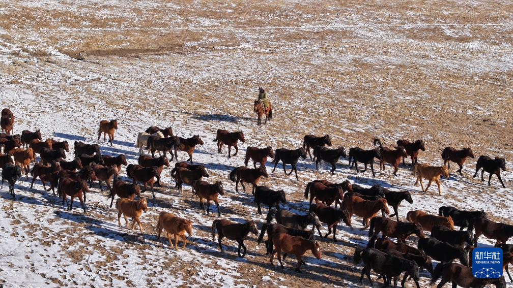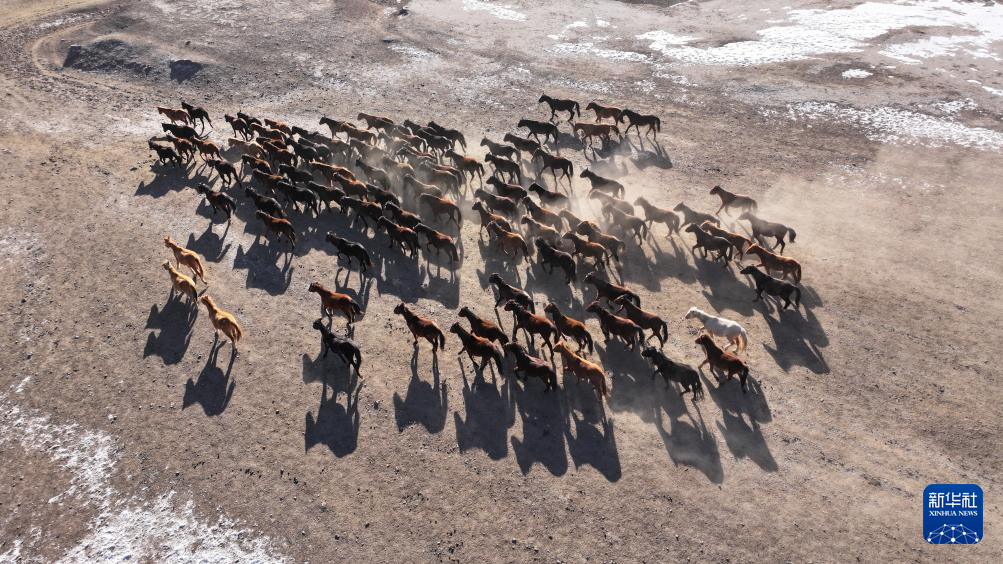 12月4日,在甘肃山丹马场一场,马群从天然草场转场至茬地(无人机照片)。