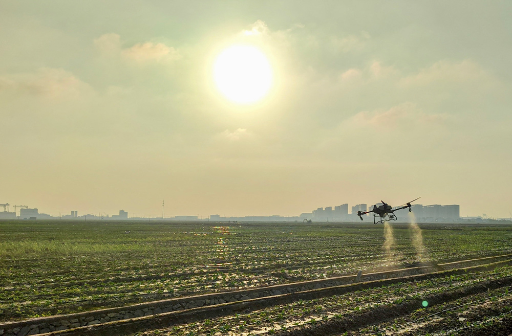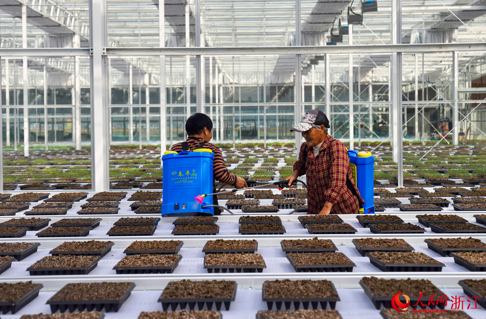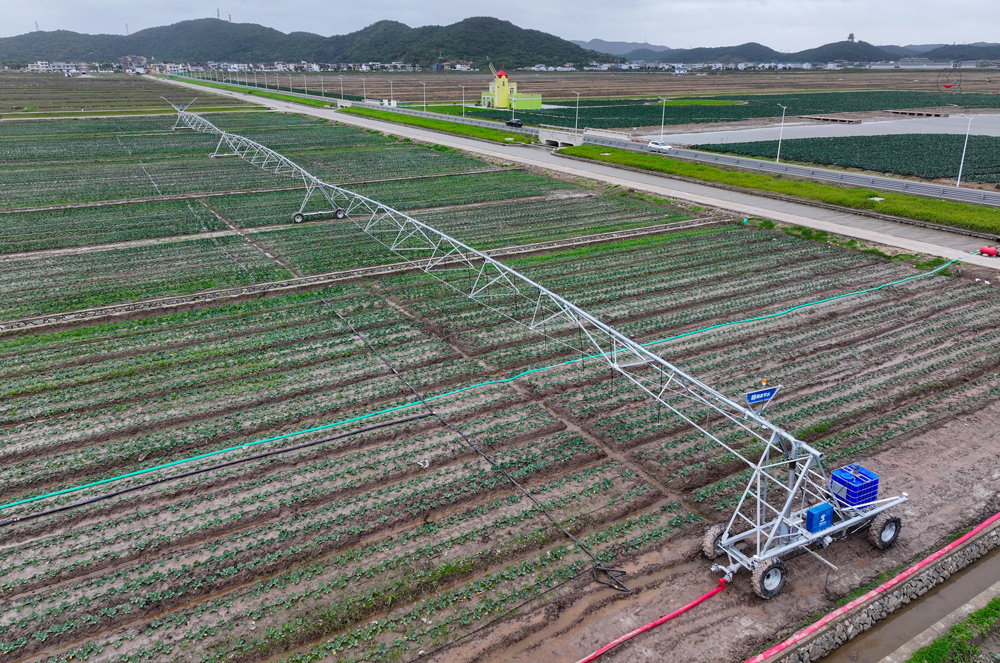 近日,走进浙江舟山岱山现代农业产业园区,记者看到,辽阔的农田上无人植保机、平移式喷灌机、无人拖拉机正在火力全开地工作,育苗工厂和无土栽培大棚里,工作人员正在对油菜苗喷滴补水。