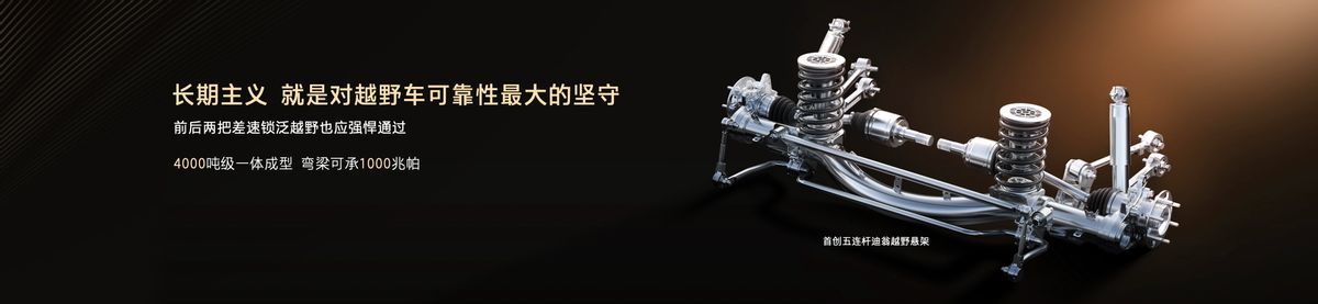 硬件布置上,搭载前后桥机械差速锁,实现前后轴绝对同转,提升脱困能力上限;后悬架采用迪翁五连杆越野专用后悬架,结合4000吨液压一体成型技术,确保强度的同时容纳更大驱动电机模块。
