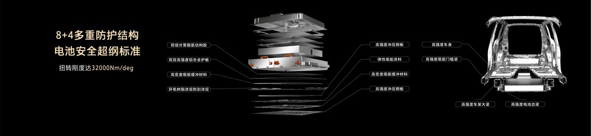电池安全方面,电池包采用强化铝型材壳体、边梁强化 + 双层结构,扭转刚度达32000N·m/deg,上壳体选用高温复合材料与多层隔热防火材料,实现单电芯热失控时整包不起火,防水等级超IP68,远超行业标准。