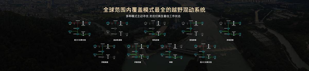 功率分流混动技术虽已有27年历史且市场保有量最多,但此前因发动机在越野大负荷工况下轮端扭矩不足以及沙漠等高速大负荷场景单挡功率分流调节能力有限,一直未应用于越野车型。长城Hi4-Z架构通过创新的功率分流 + 三挡前驱模块高集成设计,双电机分布式布置,成功攻克难题,涵盖纯电、增程、功率分流、直驱、并联、四驱等全部混动工作模式,成为全球覆盖模式最全的越野混动系统。