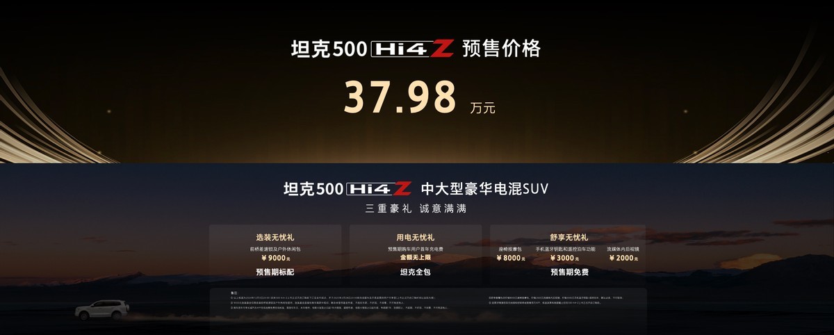 预售现场,坦克品牌执行副总经理谷玉坤先生公布预售价37.98万元,并为首批预定用户送上总价值超2.2万元的三重大礼,包括选装无忧礼、用电无忧礼和舒享无忧礼,引发全场欢呼。
