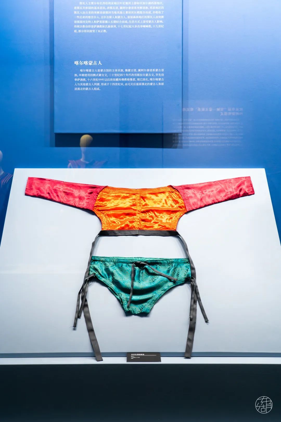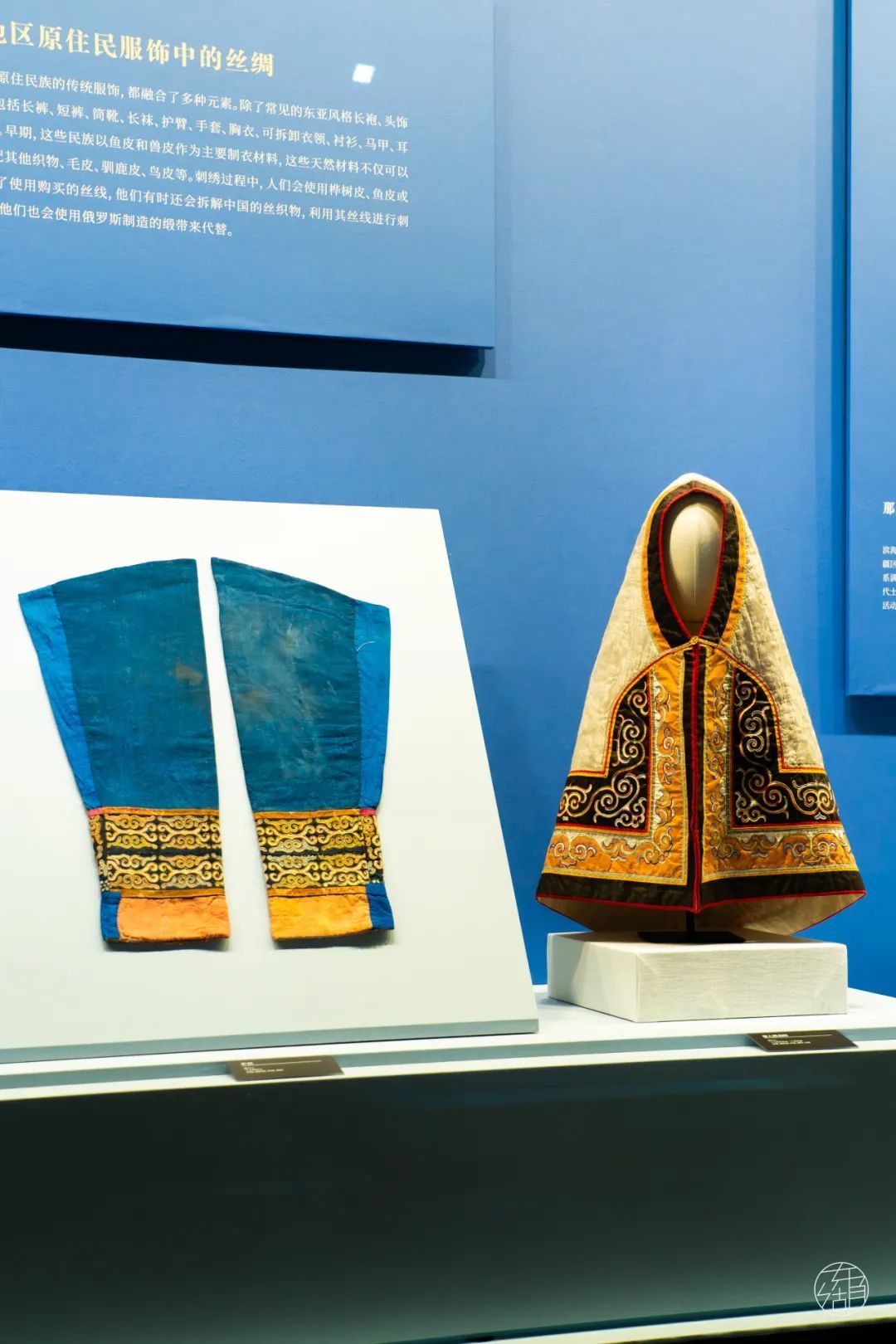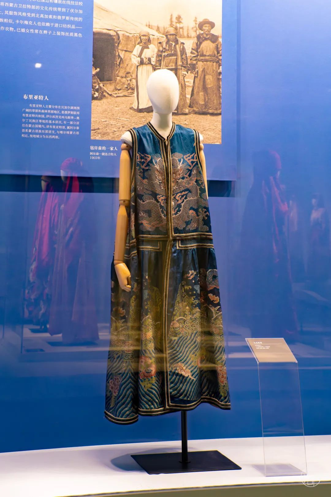 而对南西伯利亚地区的原住民来说,彩色滚边和镶嵌丝线技法更为常见。以展厅里的这件「龙袍」为代表,它实则是一件布里亚特人的女式坎肩。