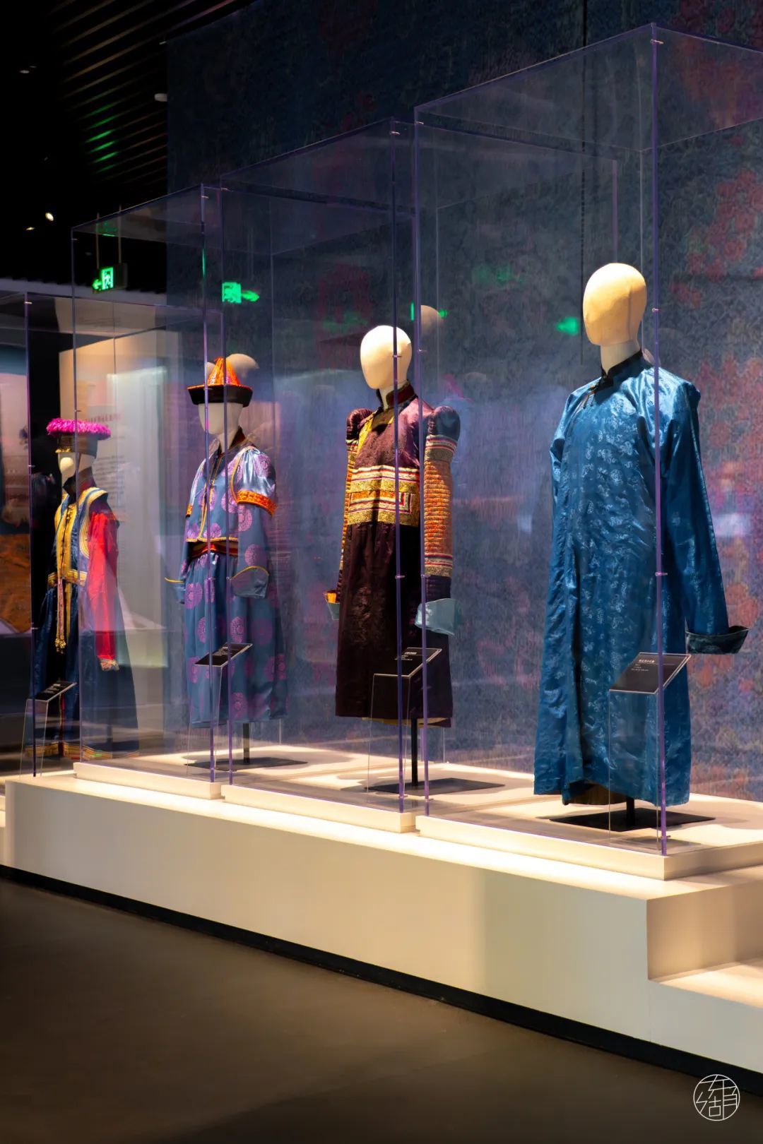 放眼望去,丝绸服饰在不同的角度下泛着淡淡的珠光。走近至玻璃展柜前,展品精致的走线一览无余,件件皆为艺术品。