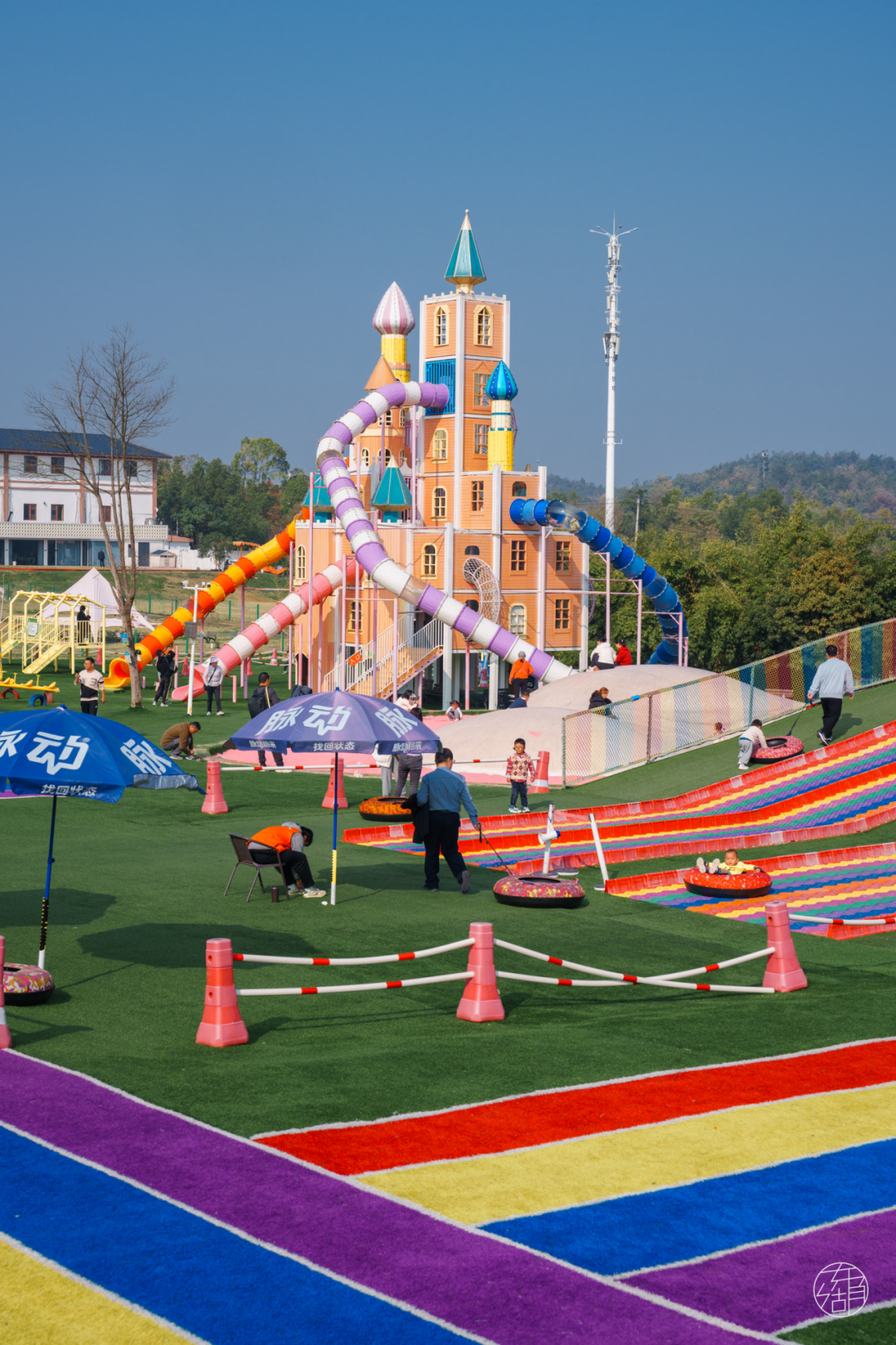 占地约2万平米的户外无动力乐园「我们正童年亲子营地」,有奇妙手工坊、趣野乐园等多个分区,彩虹滑道、梦幻城堡、高空攀爬蹦床等近二十种游乐项目,可以沉浸式玩上一整天。
