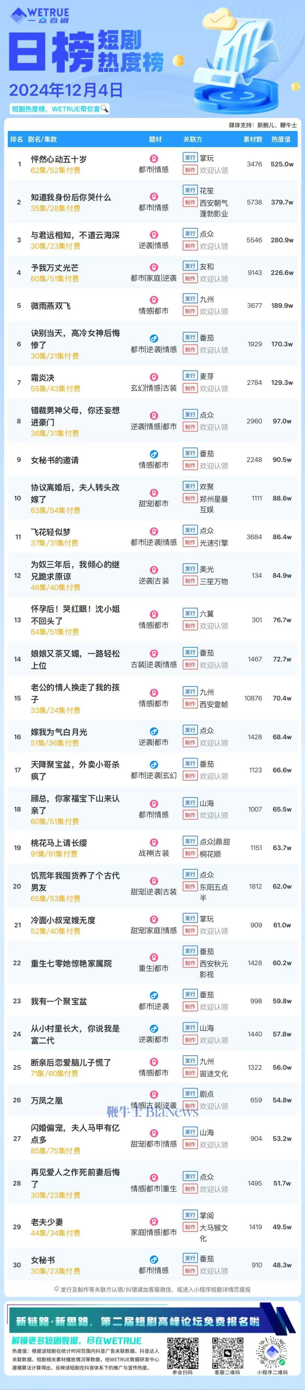 编者按:为帮助短剧从业者提供更多信息,专注于短剧报道的新腕儿和科技媒体鞭牛士联合WETRUE短剧热度榜共同推出短剧热度榜。