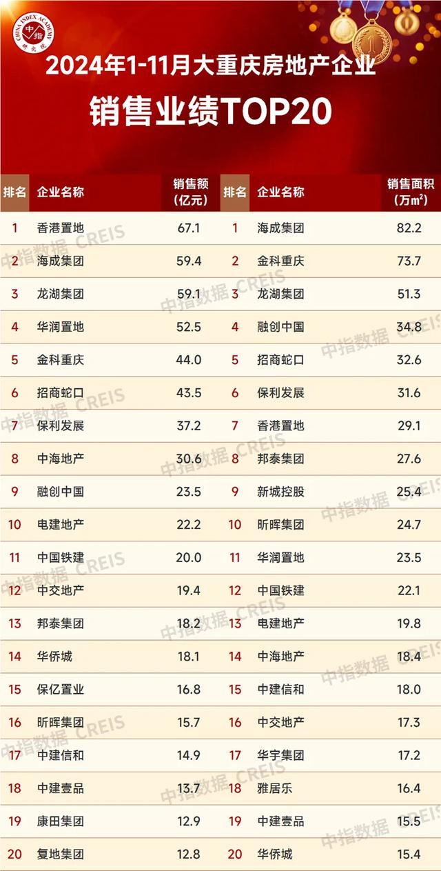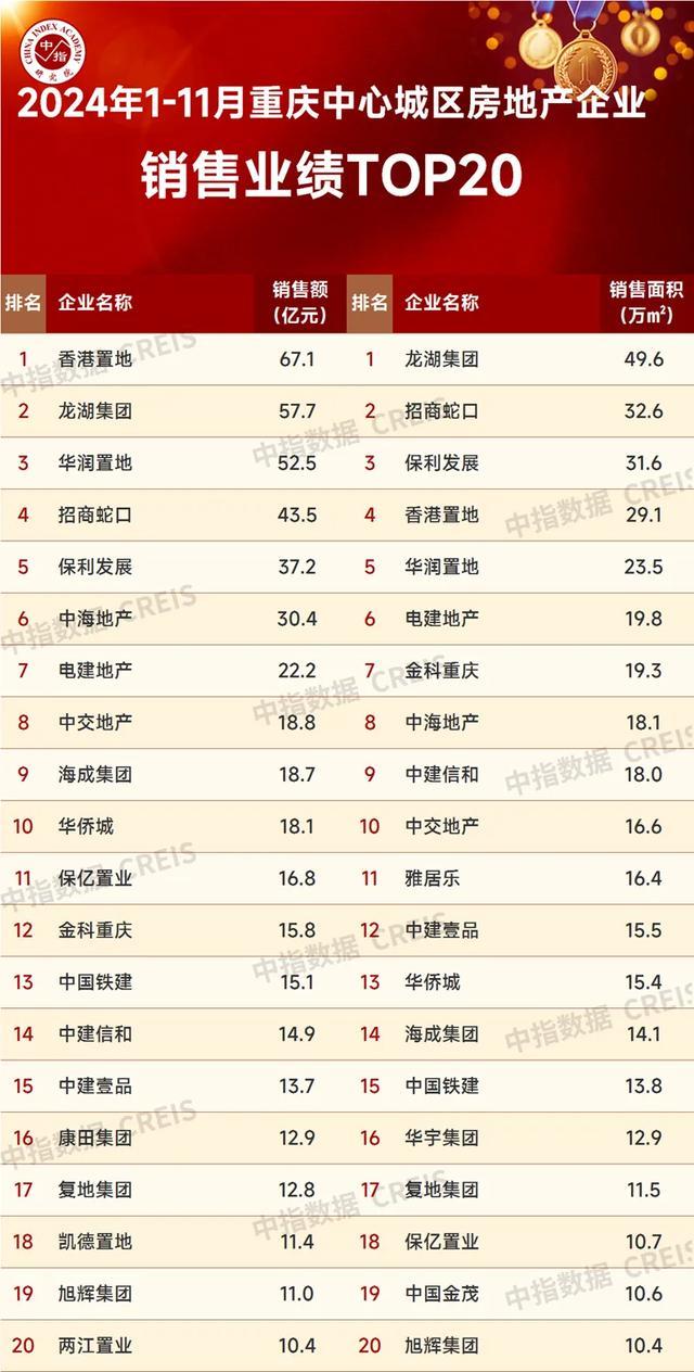 2024年1-11月重庆中心城区房企TOP20销售金额为500.9亿元,TOP20门槛值为10.4亿元;TOP20销售面积为389.6万㎡,TOP20门槛值为10.4万㎡。