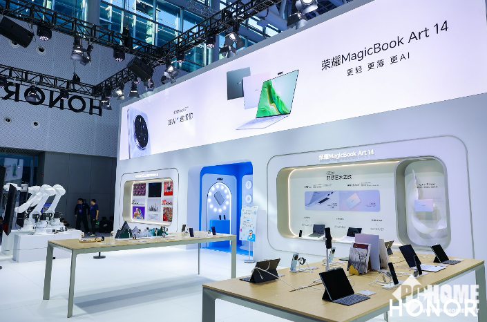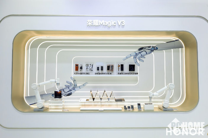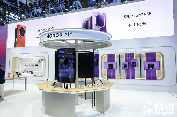 本次展会,荣耀打造了面积超过385平方米的展馆,包含了HONOR AI、荣耀Magic7系列、荣耀MagicOS9.0、荣耀Magic V3、荣耀MagicBook Art 14、雅顾拍摄、保时捷设计、HONOR Talents区等多个主题专区。除了荣耀Magic7系列等最新发布的旗舰产品之外,多款智能手环、亲选等全场景产品也悉数亮相。