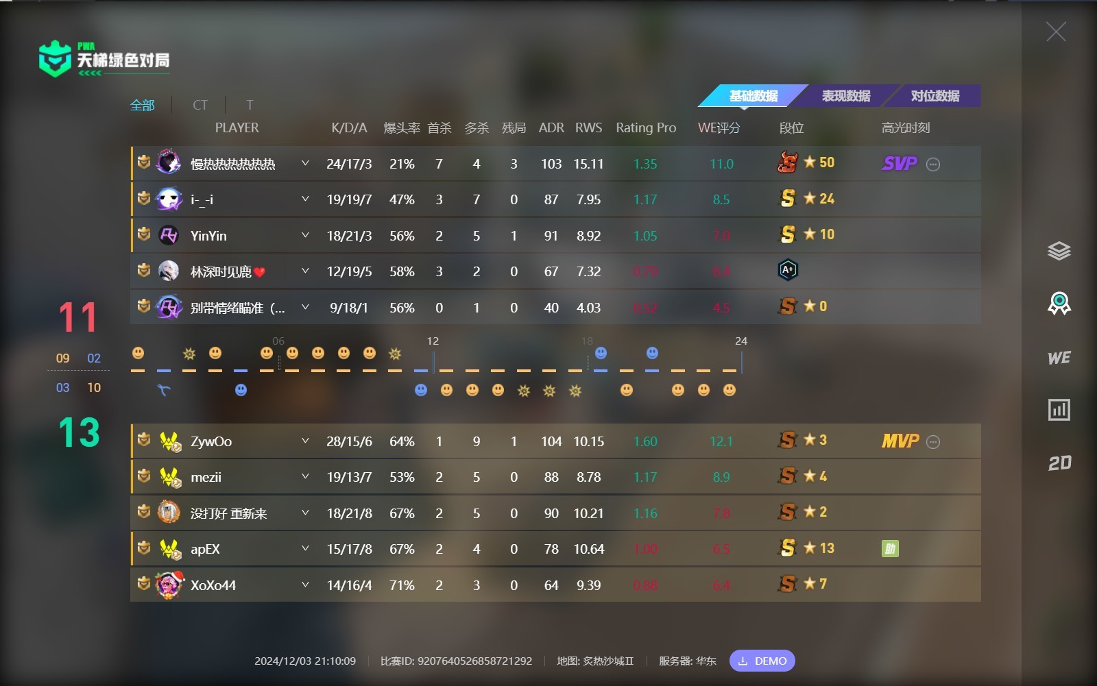 最终由ZywOo、mezii、apEX领衔的团队以13-11赢下比赛。