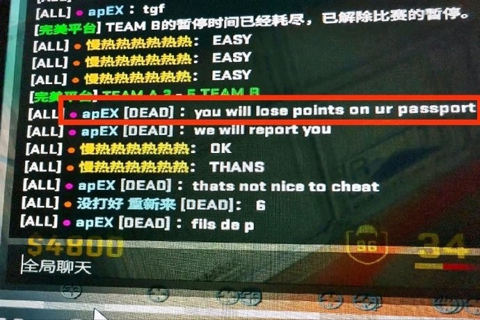 在12月3日的一场完美天梯组排中,中国玩家与小蜜蜂三人组公屏互动,现31岁Vitality法国指挥Dan “apEX” Madesclaire质疑中国玩家开挂,被质疑玩家“慢热热热热热热”先表示自己是ZywOo粉丝,随后打出EASY EASY EASY,apEX此后回应在游戏公屏写道:“你的护照会被扣分,我们会举报你,开挂一点都不友好,fils de p(法语骂人词汇)。”