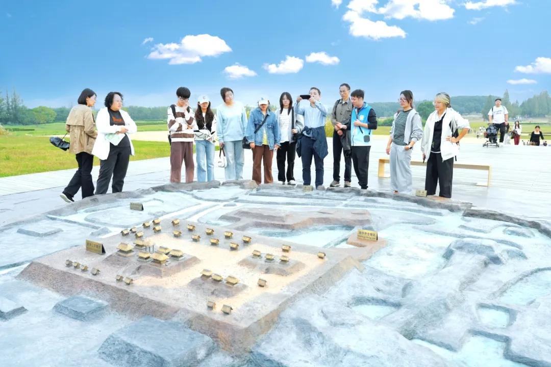 随后,学生们去往宫殿巨型木构展示点。这里展示了良渚古城钟家港发掘出的巨型木构件,据考古推测极有可能是建造莫角山宫殿的梁柱。宫殿巨型木构展示点前,还原良渚先民们加工巨型木构件的金属网格雕塑,向学生们展现了良渚先民的生活智慧和精湛工艺。