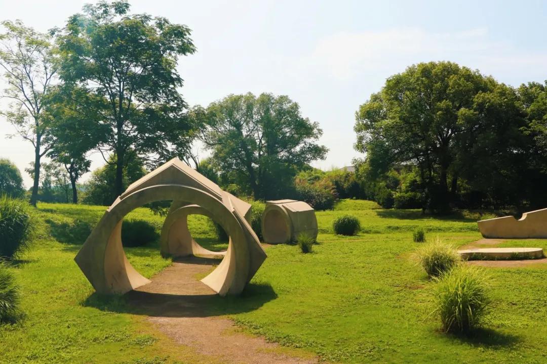 陆城门旁沿着小道,就可来到玉器穿行与城墙演变展示区。玉器穿行区域摆放着放大的玉琮、玉璧、玉鸟、玉镯形器等雕塑,学生们可以近距离了解良渚玉器,促进他们结合历史书本,深入学习良渚玉文化。