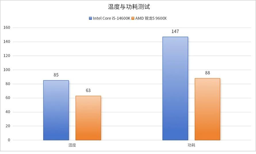 在温度与功耗上,AMD锐龙5 9600X处理器领先的幅度就更加明显了,功耗低了50W,而温度也低了18摄氏度,也就是说用户可以花费更少的预算在散热器以及电源上,这对于精打细算的主流玩家来说显然十分地有用。