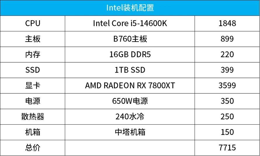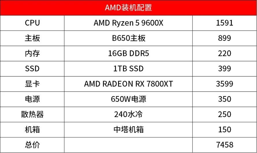 紧接着我们来看AMD以及Intel的装机配置单,两家的差距其实都在CPU上,也就是说拥有更加出色游戏性能的AMD锐龙5 9600X处理器在售价上反而便宜了250元,此外在主板选择上,我们也选择了B760以及B650这两款主流的主板,主打的就是一个高性价比。