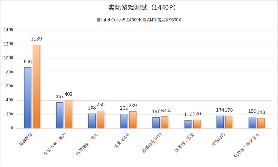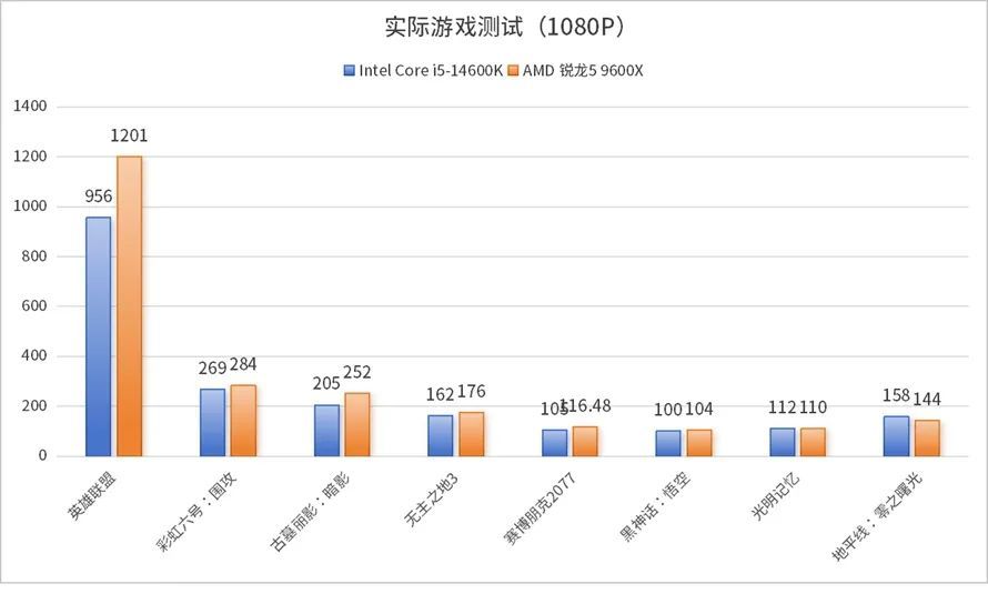 而在电竞游戏中,这种领先幅度就更大,《彩虹六号:围攻》的帧率领先在20-30帧,而《英雄联盟》更是领先200-300帧左右。尽管上千帧的成绩转换到实际游戏中的体验几乎难以察觉,不过可以充分展现出AMD锐龙5 9600X处理器在电竞游戏中优秀的表现。