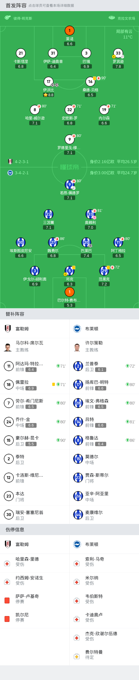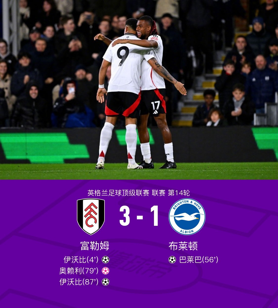 在英格兰足球顶级联赛第14轮的较量中,富勒姆坐镇主场迎战布莱顿。比赛中,富勒姆的伊沃比表现出色,成功打入两球,展现了出色的进攻能力。布莱顿方面,巴莱巴在若昂-佩德罗的助攻下为球队扳回一城。然而,布莱顿的奥赖利不慎自摆乌龙,给了对手额外的优势。最终,富勒姆以3-1的比分战胜布莱顿,取得了本场比赛的胜利。