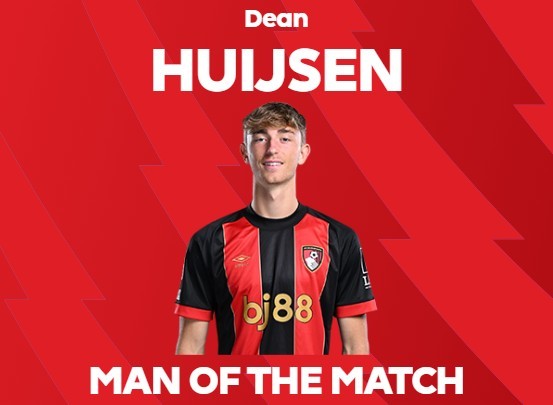 官方消息,赫伊森当选伯恩茅斯对阵托特纳姆热刺一役全场最佳。