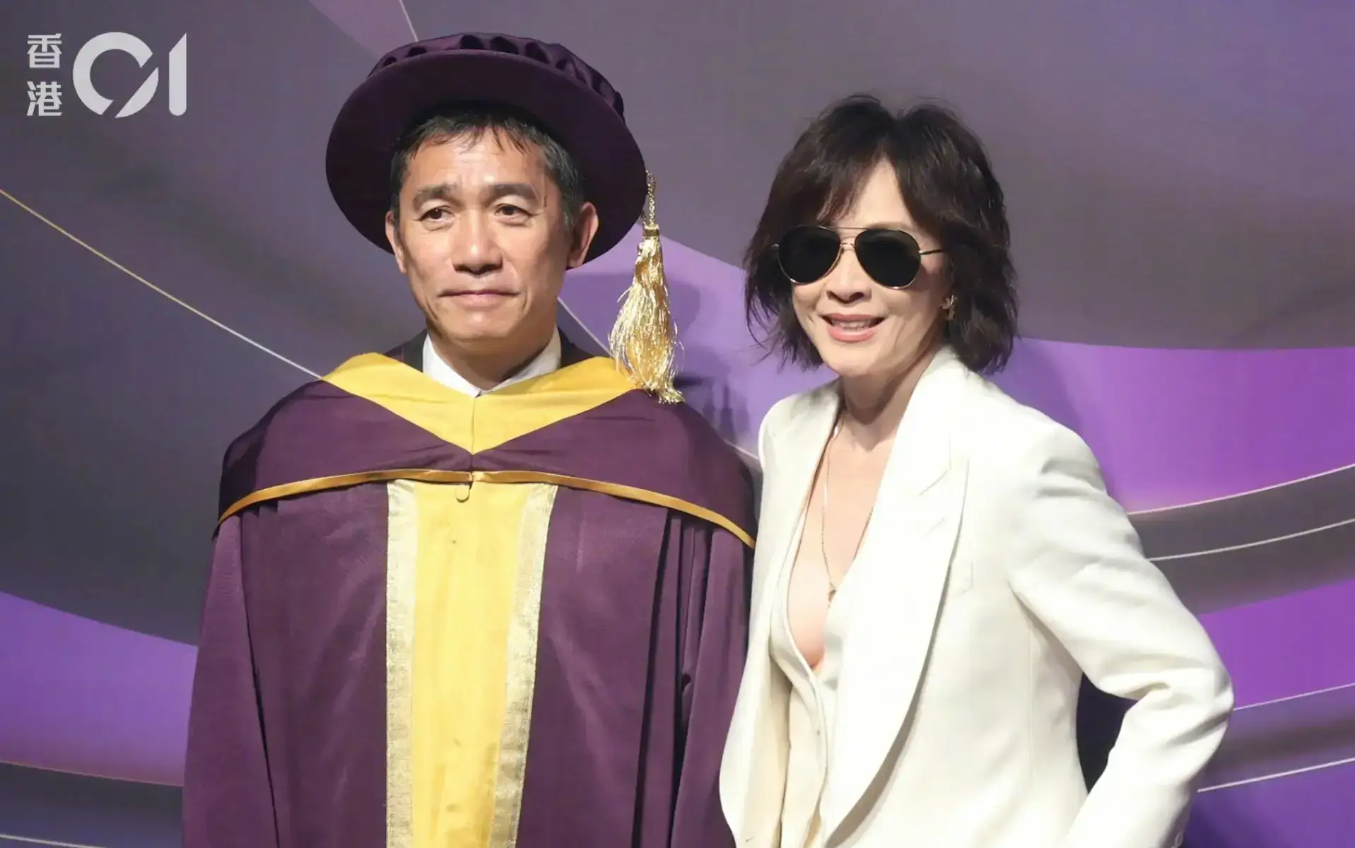 12月5日,梁朝伟、洪金宝、许鞍华获香港演艺学院颁授荣誉博士,以表扬各人在演艺界上作出的巨大贡献。当天,刘嘉玲陪老公梁朝伟同框亮相,穿白色西装配短裙造型靓丽吸睛!