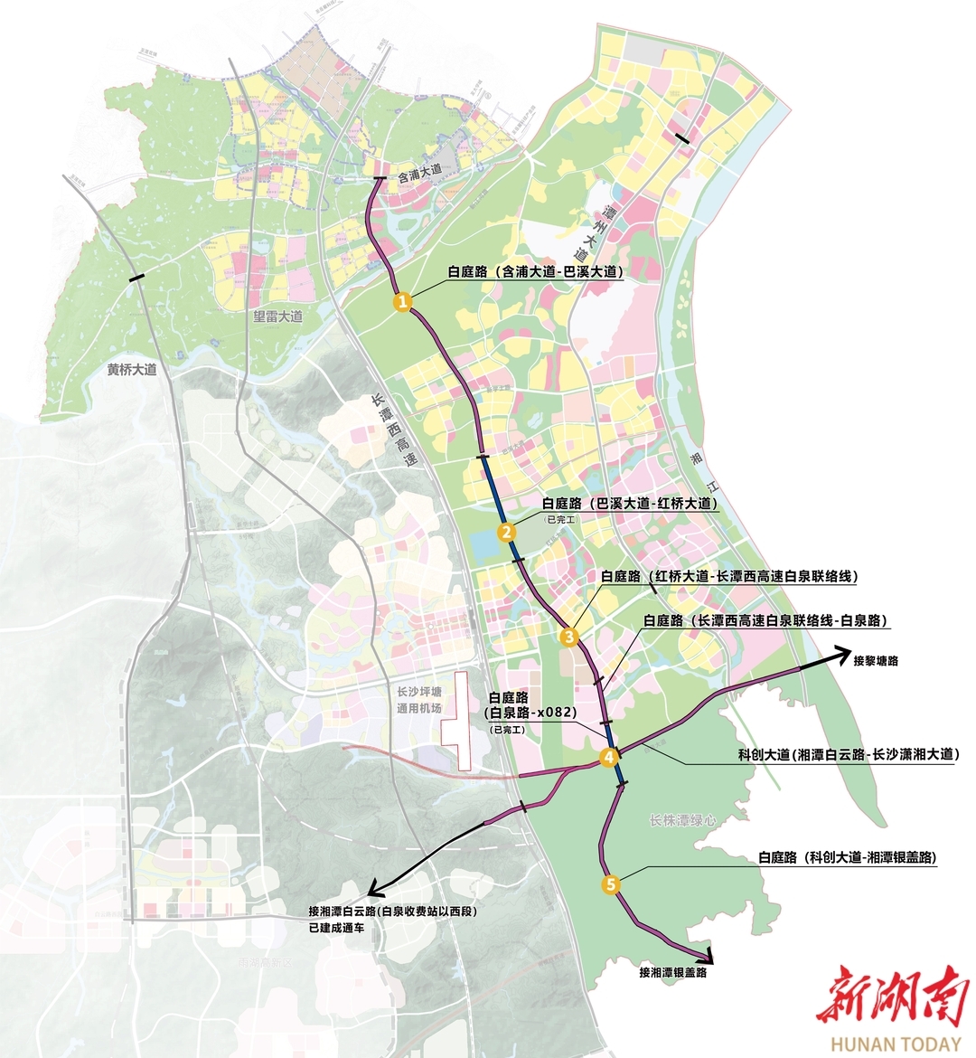 白庭路北起长沙市岳麓区含浦大道,南至湘潭界银盖路,是一条南北向的重要融城主干道,全长约15.15千米,共分五段,目前已全线启动建设。其中,巴溪大道—红桥大道、白泉路—X082两段已完成建设,含浦大道—巴溪大道段正在进行土方、桥梁桩基及隧道进洞施工,红桥大道—白泉路段全线路基基本拉通,即将启动水稳施工。