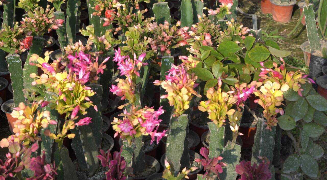 王宗介绍:“我主要种植的是仙人科系列的几个品种,像蟹爪兰系列、仙人球系列和令箭荷花系列。现在蟹爪兰已经进入销售高峰期,正是花期。现在这三个棚有五万珠左右,嫁接成功并且能够上市销售的有一万三千多珠。”