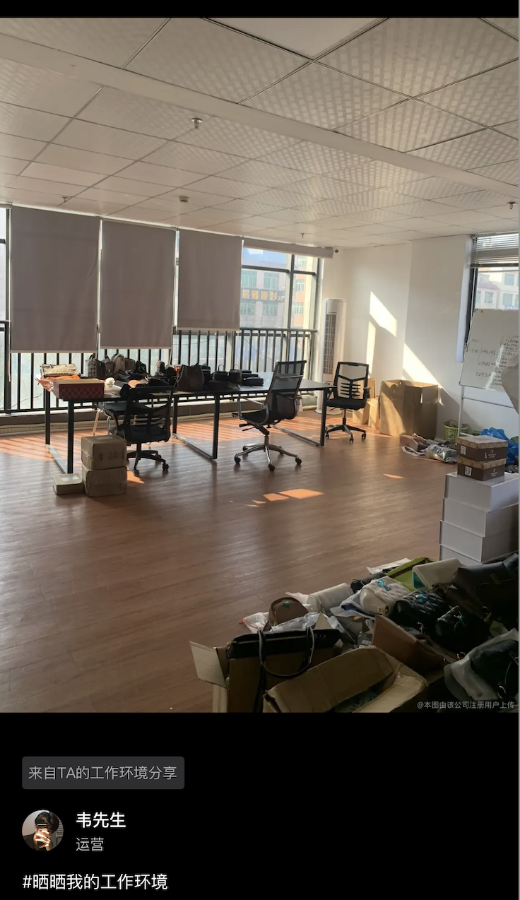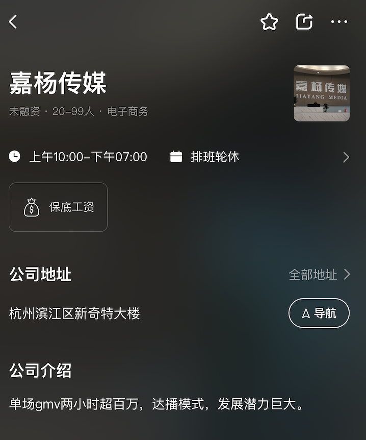 根据boss直聘上的招聘信息,嘉杨传媒的介绍中写道:单场gmv两小时超百万,达播模式发展潜力巨大,目前所在地为杭州滨江区新奇特大楼。从公司发布的照片来看,工位旁也是堆满了各种包包。