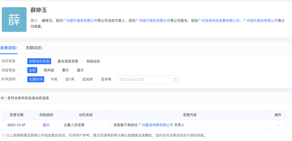 从公开信息看,路遥隶属公司为广州嘉杨传媒,根据爱企查信息,广州嘉杨传媒有限公司成立于2023年5月4日,当前的最终受益人为韦嘉晟和杨璐瑶。在2023年底,广州嘉杨传媒完成了一次工商信息变更,在此之前最终收益人为薛婷玉。