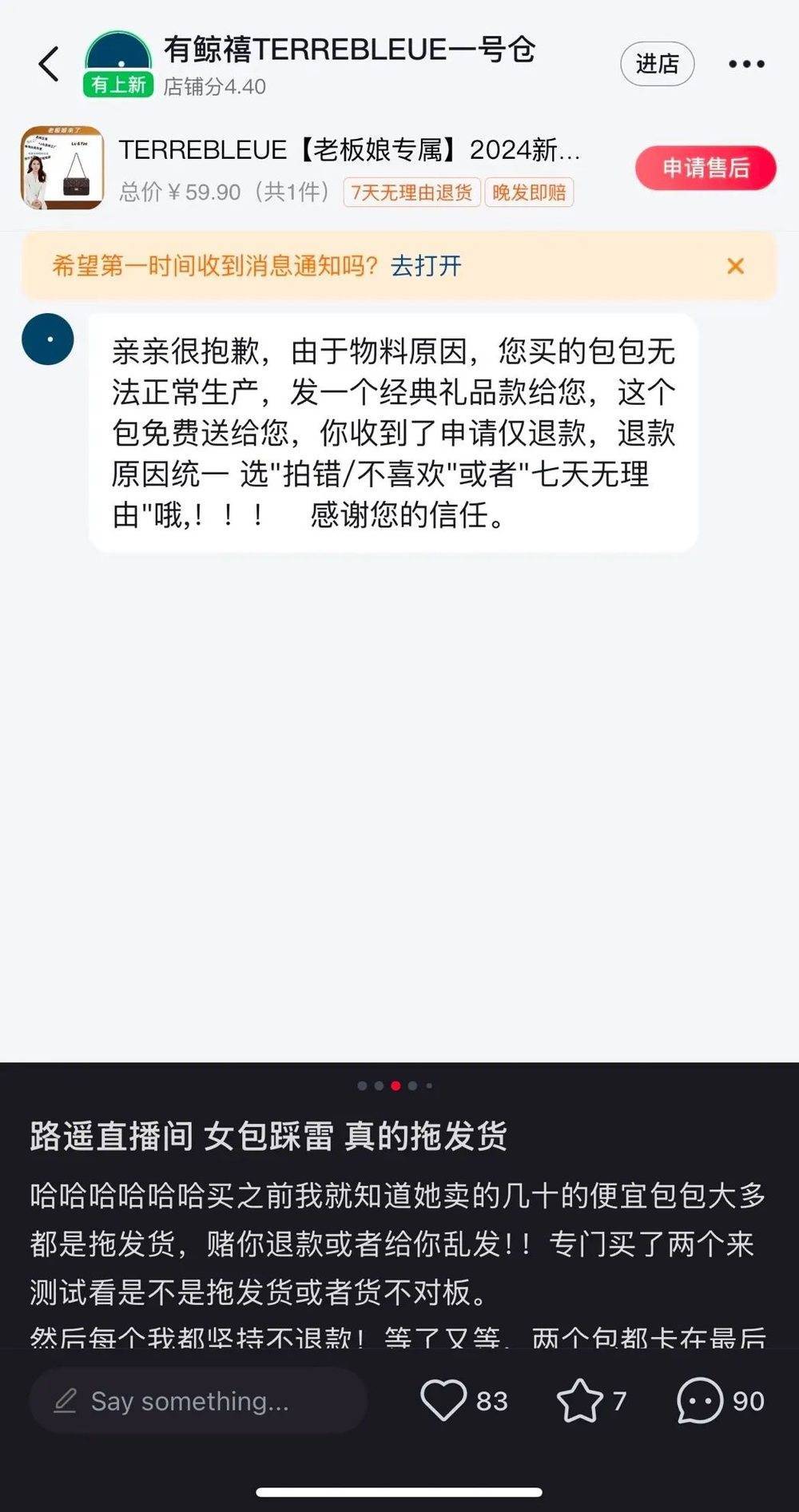 还有网友指出,每次上架性价比高的便宜包根本拍不到,但是65元以上的包显示就都有货,而且就算拍到了便宜的包她家也经常不发货,所以就是打着便宜的旗号为了那些并不便宜且有利可图的主推品做铺垫。