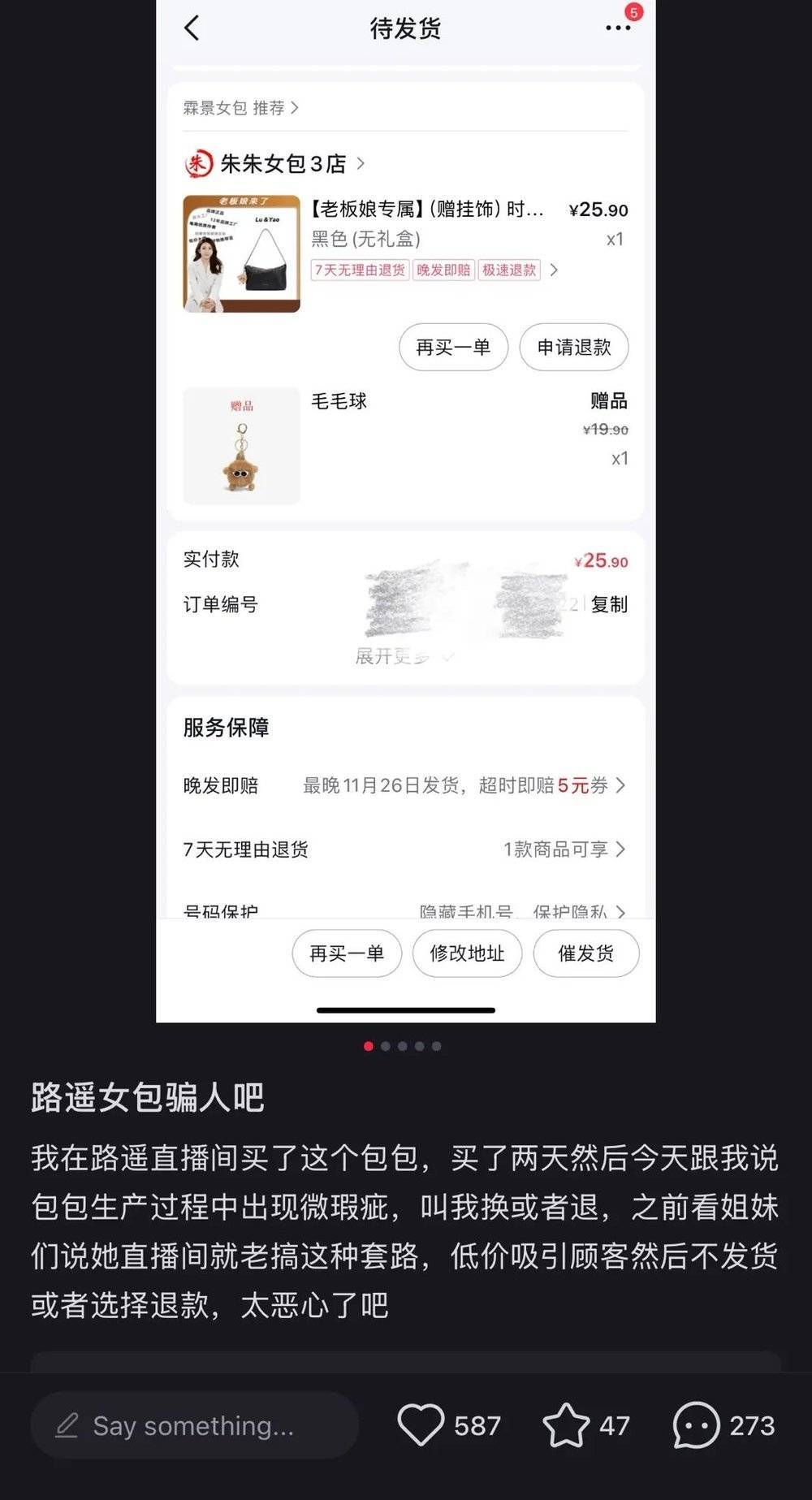 还有不少抢到便宜包的测评提到,等了很多天才发货的包和直播间货不对版、质量堪忧,一打开包裹就是刺鼻的胶水味。有网友感慨道“路遥直播间30元的包,就像是地摊上10元、20元处理的东西,没有一秒犹豫,退货。”