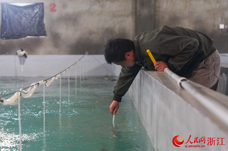在象山港湾水产苗种有限公司的育种车间里,副总经理、技术骨干陶双双正在测量岱衢族大黄鱼亲鱼池里的水温。“这段时间是雌雄亲鱼即将性成熟的阶段,水温把控最为关键,需要从20℃缓缓调高至22℃。”陶双双说,接下来这批亲鱼所产的鱼卵将会经过前后仅两个月的育苗,再发给村里以及省内外的养殖户。