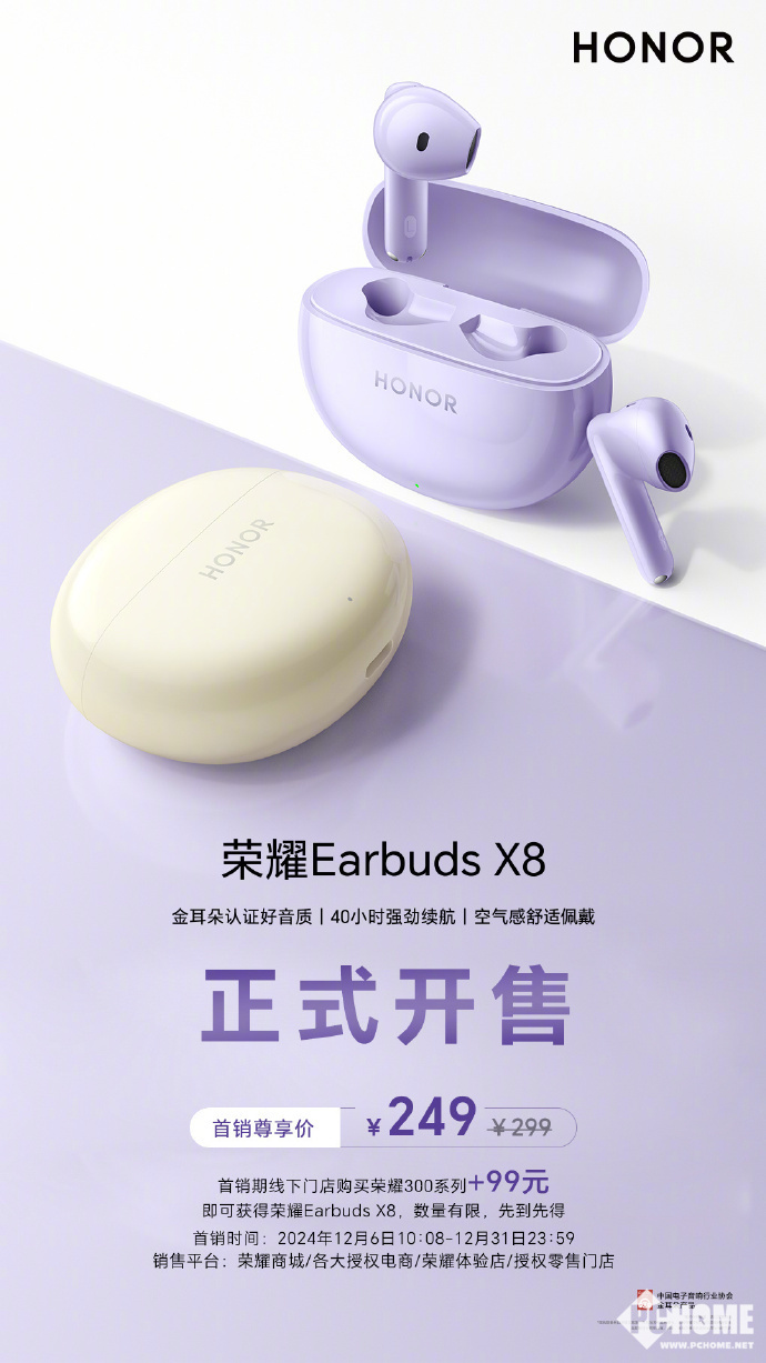 12月8号消息,荣耀耳机Earbuds X8正式开售,通过金耳朵认证好音质、拥有40小时强劲续航、空气感舒适佩戴,首销价249元。此外,在首销期线下门店购买荣耀300系列+99元即可获得Earbuds X8。