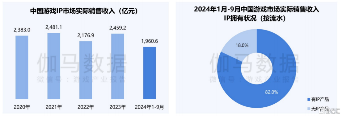 伽马数据的《2024中国游戏产业IP发展报告》进一步证实了这一点。2024年前三季度,中国游戏IP市场实际销售收入达到1960亿元,其中82%由IP产品贡献。