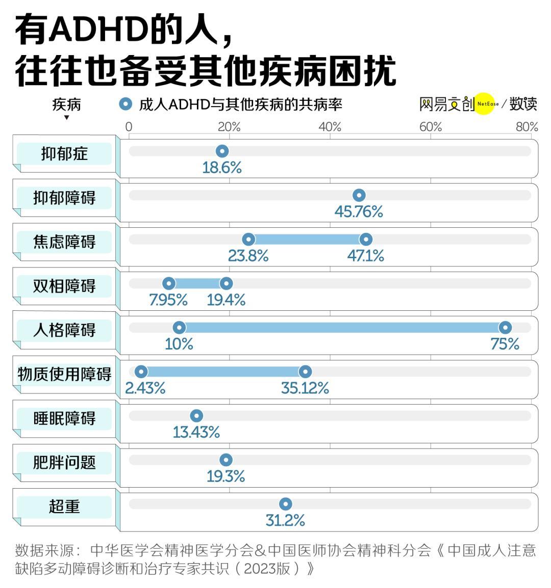 根据《中国成人注意缺陷多动障碍诊断和治疗专家共识(2023 版)》,不少成人 ADHD 患者还会同时遭受抑郁症、焦虑症、睡眠障碍等疾病困扰,甚至可能增加自杀意念和自杀行为 [9]。