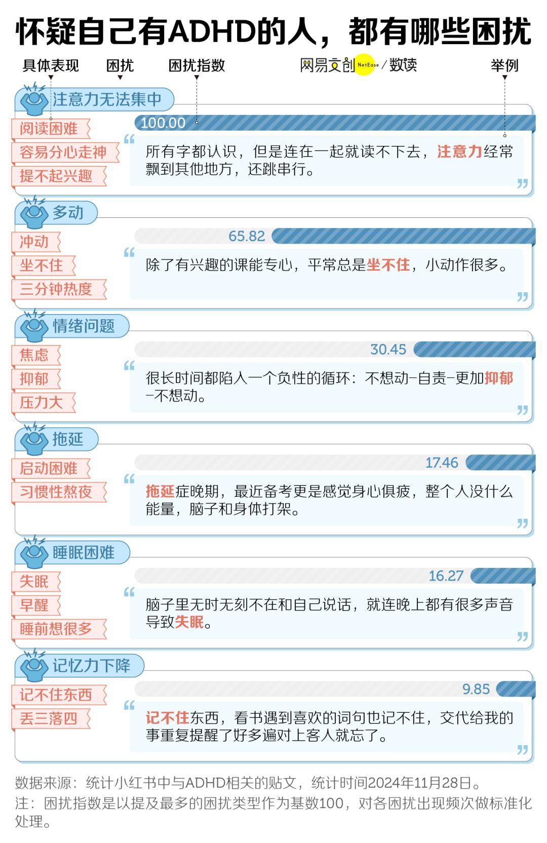 还有很普遍的烦恼是“阅读困难”,难以一次性摄入较长的信息,无论是开会,还是看文件,都容易分心走神。