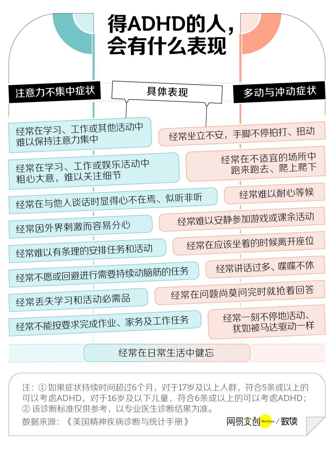 但其实,确认 ADHD 并不需要完全符合所有症状,如果症状持续时间超过 6 个月,对于 17 岁或以上人群,符合 5 条或以上的可以考虑 ADHD,对于 16 岁及以下儿童,符合 6 条或以上的可以考虑 ADHD [1]。
