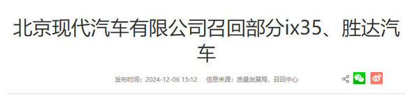 【CNMO科技消息】12月6日,CNMO科技从国家市场监督管理总局了解到,日前,北京现代汽车有限公司根据《缺陷汽车产品召回管理条例》和《缺陷汽车产品召回管理条例实施办法》的要求,向国家市场监督管理总局备案了召回计划。决定自2024年12月30日起,召回2012年11月29日至2014年10月31日期间生产的2013款胜达汽车,共计139040辆;2010年3月28日至2014年8月14日期间生产的2010-2013款ix35汽车,共计420309辆。
