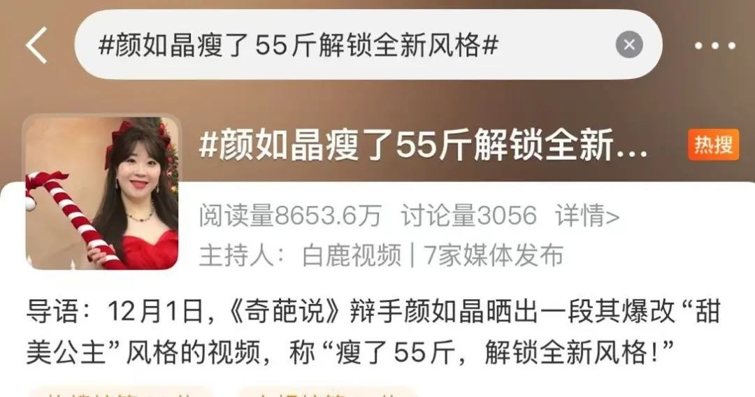 12月2日,颜如晶因减肥55斤、穿红裙解锁甜美公主风,再度登上热搜,引发热议。