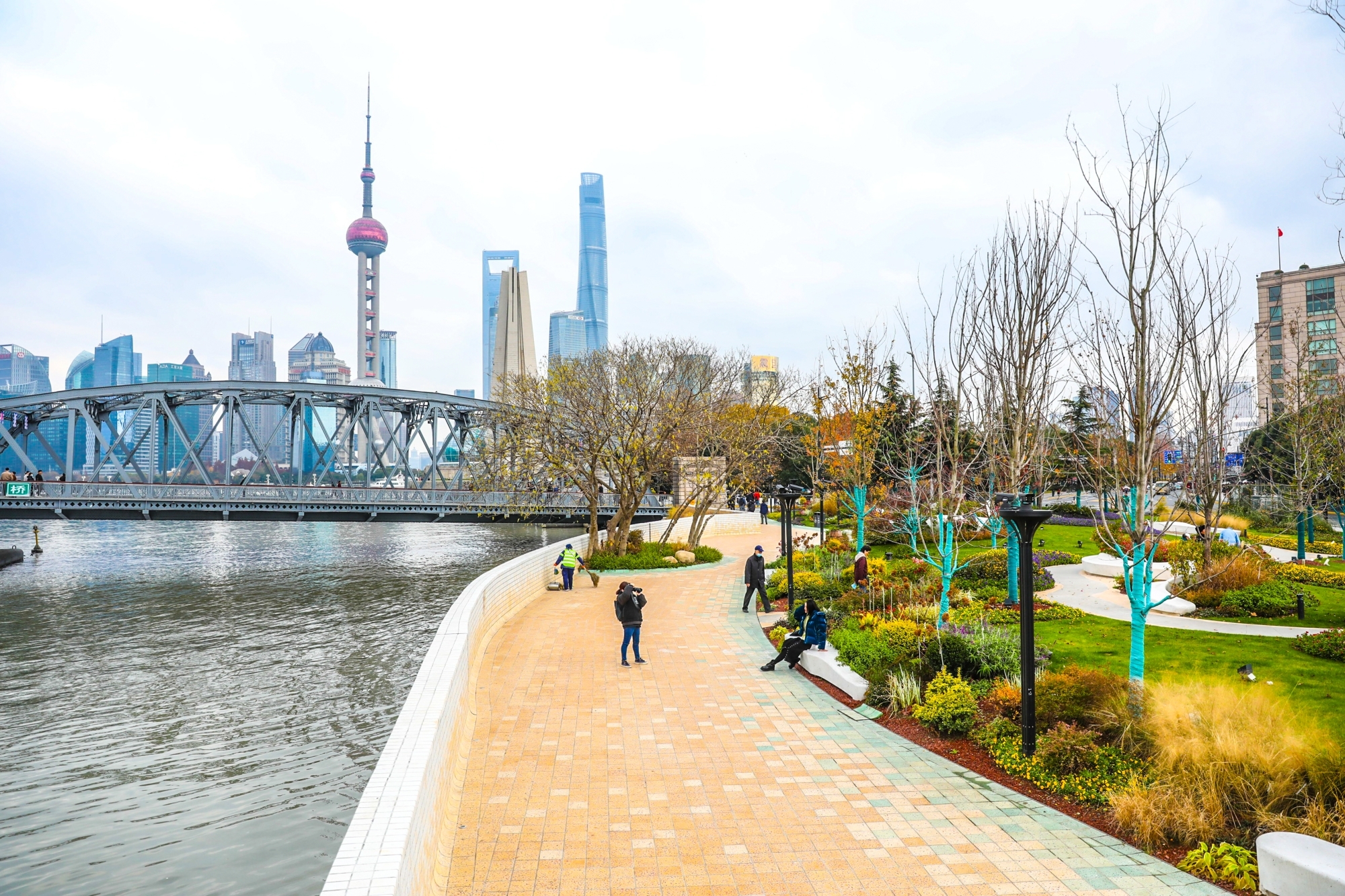 苏州河畔,暖橘色琉璃水磨石铺就的防汛墙与步道绵延3公里,是黄浦段独有的景致。