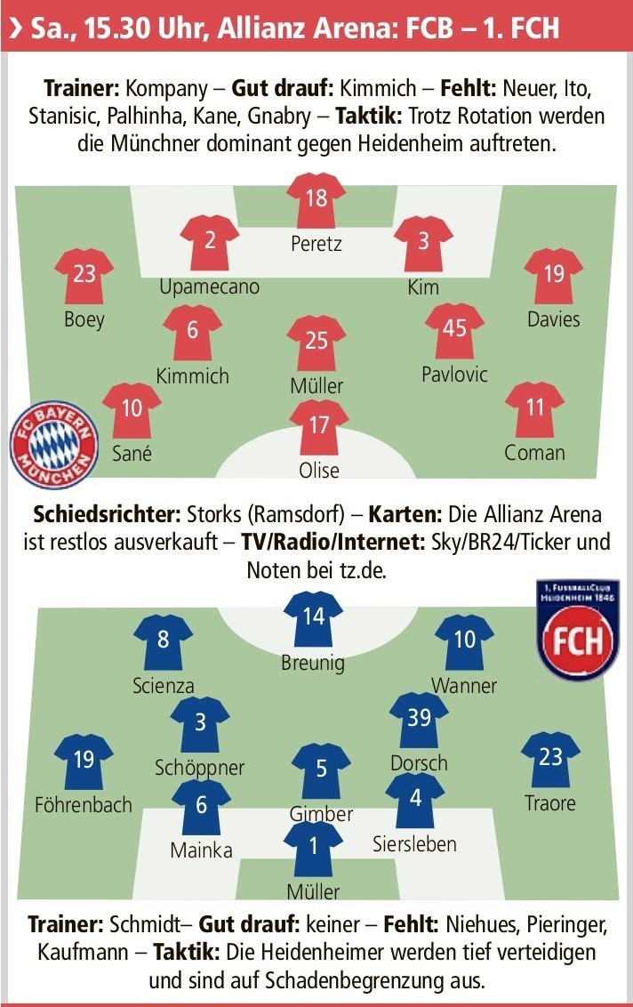 北京时间周六22:30,拜仁慕尼黑将会在德甲第13轮的比赛中坐镇主场迎战海登海姆,赛前《慕尼黑日报》预测了孔帕尼此战可能派出的首发阵容。