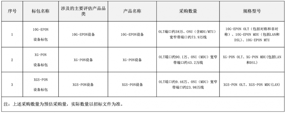 公告显示,本次集采包括3个标包:10G-EPON标包、XG-PON标包、XGS-PON标包,合计OLT端口137.56万口,ONU宽窄带端口141.08万线。