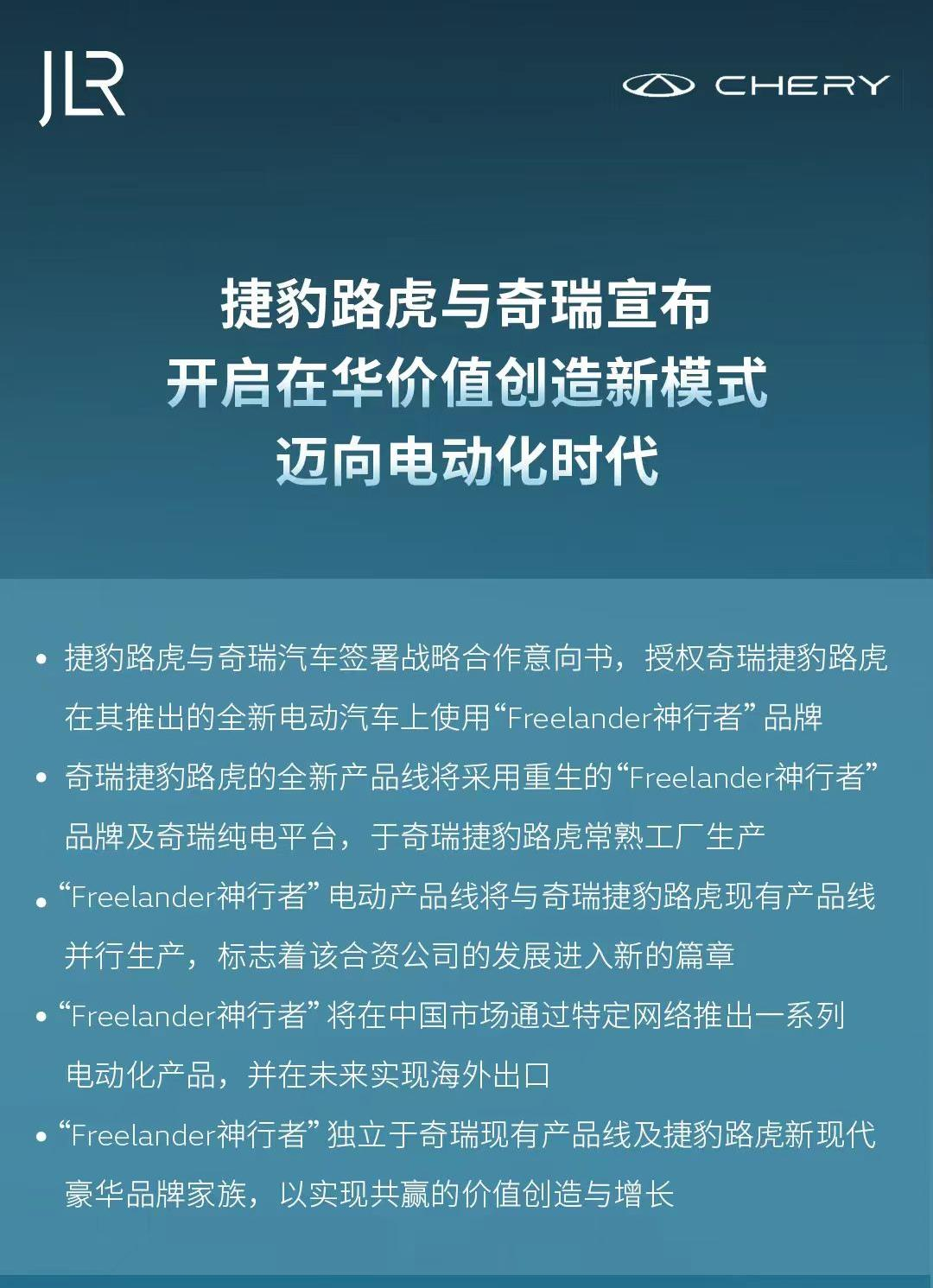 今年6月,捷豹路虎宣布与奇瑞达成合作,路虎将使用奇瑞汽车的平台生产“Freelander神行者”品牌电动汽车,这是继大众与小鹏、Stellantis与零跑之后的又一次中国车企与外国车企之间的“反向合资”。