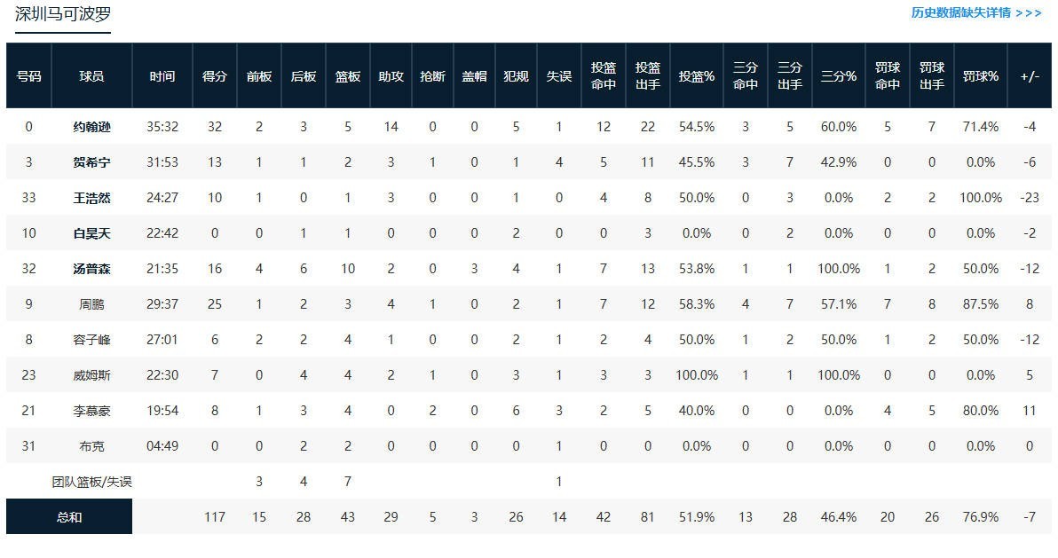 深圳马可波罗马凯尔-约翰逊30分5板12助,周鹏25分2板3助,特雷沃-汤普森16分9板2助3帽。