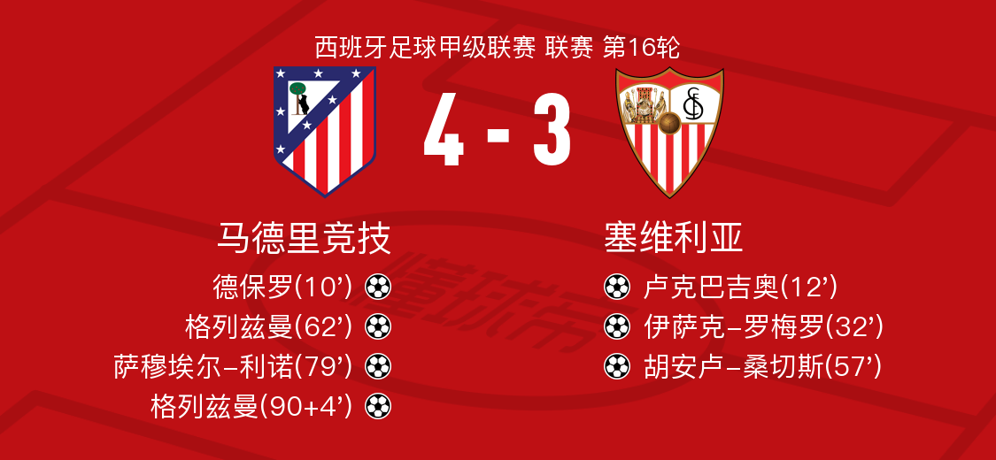 北京时间12月9日马德里竞技vs塞维利亚,格列兹曼得到全场最高的9.4分,瑟洛特得到全场最低的5.7分