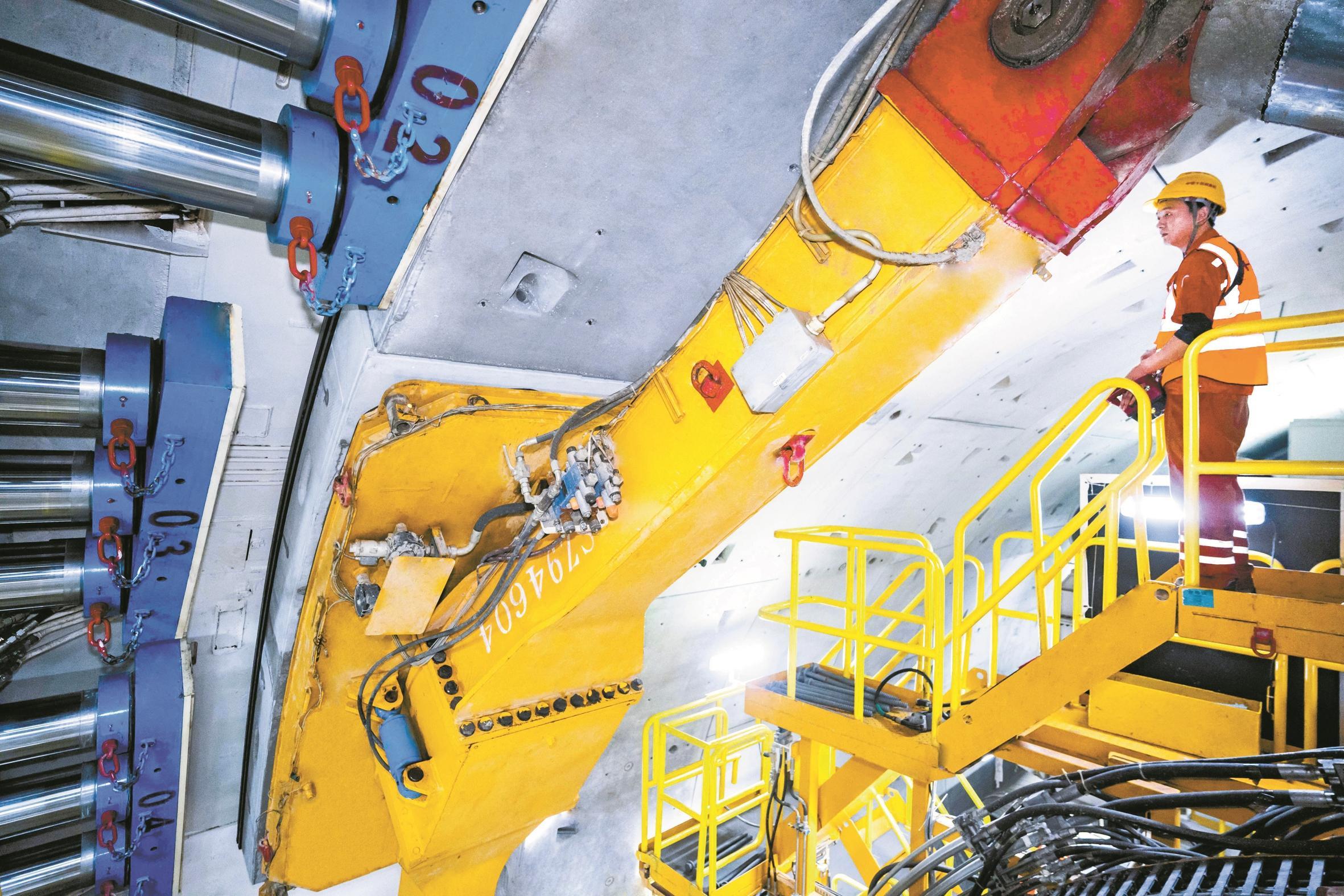 在“甬舟号”盾构机内部,建设者通过遥控器对管片拼装进行毫米级控制,再通过盾构机所搭载的同步双液浆工艺,使其快速达到有效强度,补偿地层损失,控制管片上浮。在目前掘进的1000多米距离中,地表沉降始终控制在5毫米以内,实现对地面既有建筑的零扰动。(沈莉 宋新宇 摄)