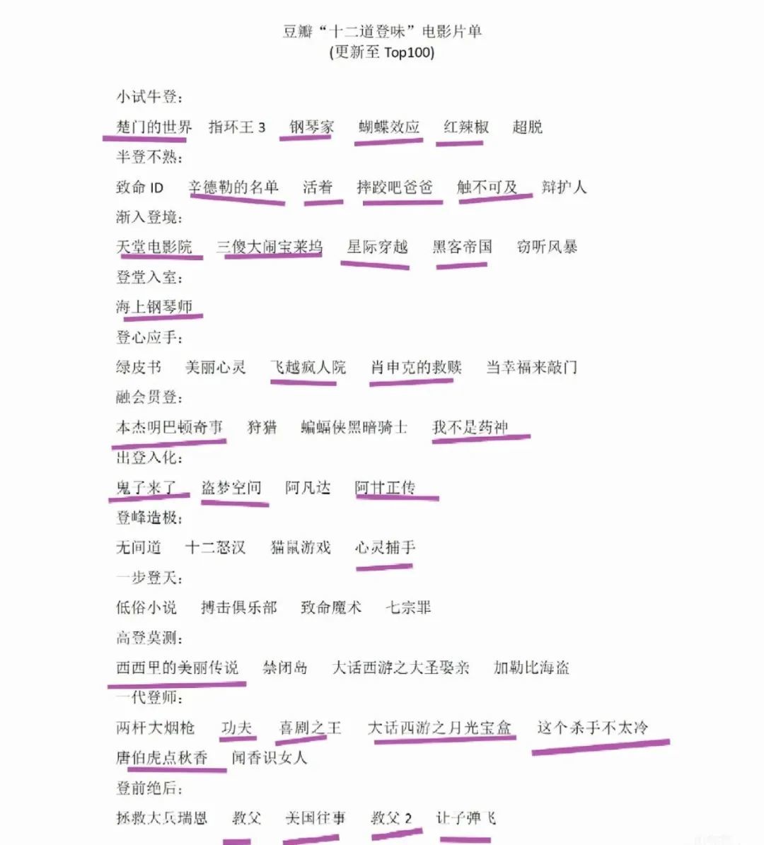 按照这个标准,豆瓣TOP250的多数经典电影如《教父》《美国往事》《肖申克的救赎》纷纷“中弹”,近几年热映的大片《满江红》《奥本海默》《战狼》也没逃过,还有网友根据“含登度”将这些电影分为“小试牛登”“登堂入室”“登峰造极”等不同境界。