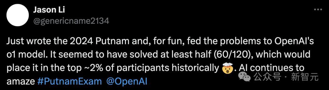 另一位研究员Jason Li测试后惊叹道,o1似乎已经解决掉了一半的问题(60分/满分120),这在普特南竞赛的历史排名中大约能冲进前2%的参赛者之列。