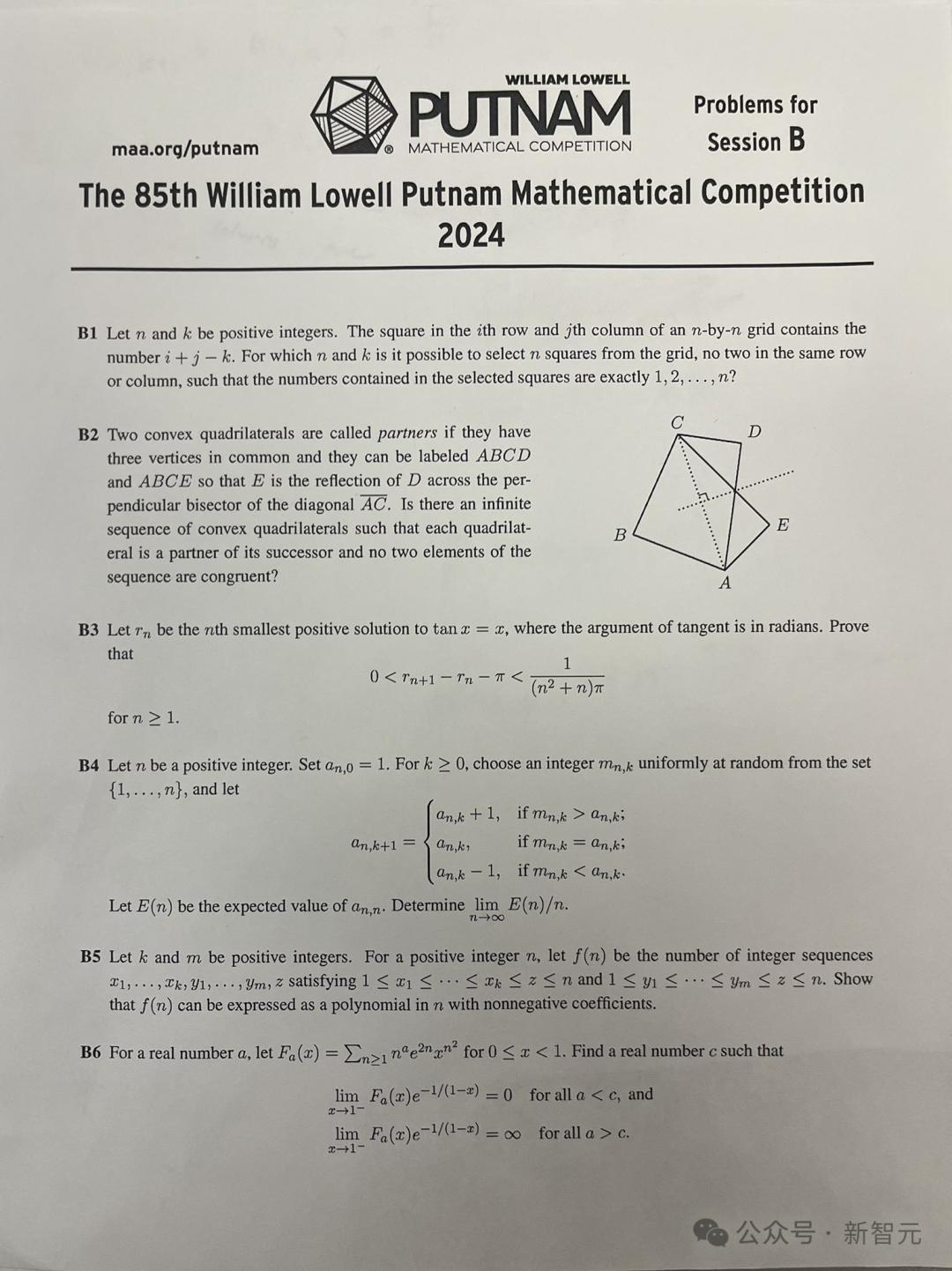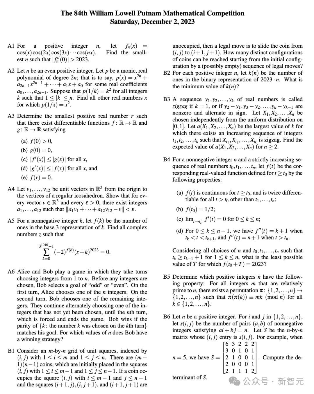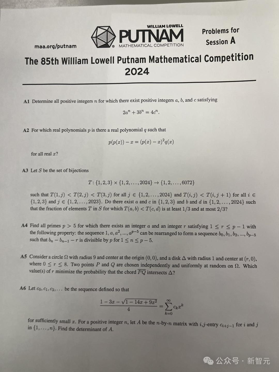 普特南数学竞赛(全称William Lowell Putnam Mathematical Competition)专为美国和加拿大的本科生设立,每年于12月举办一届,今年是第85届年赛。
