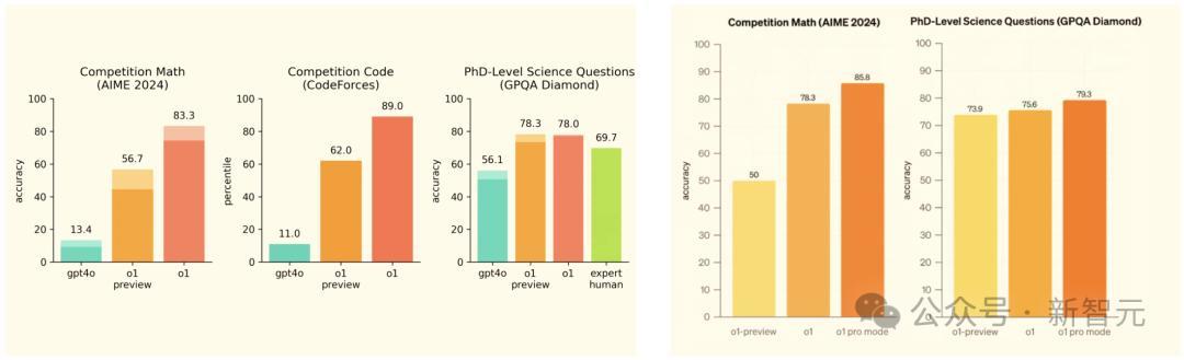 相较于o1-preview,o1数学性能提升27%,o1 pro提升36%